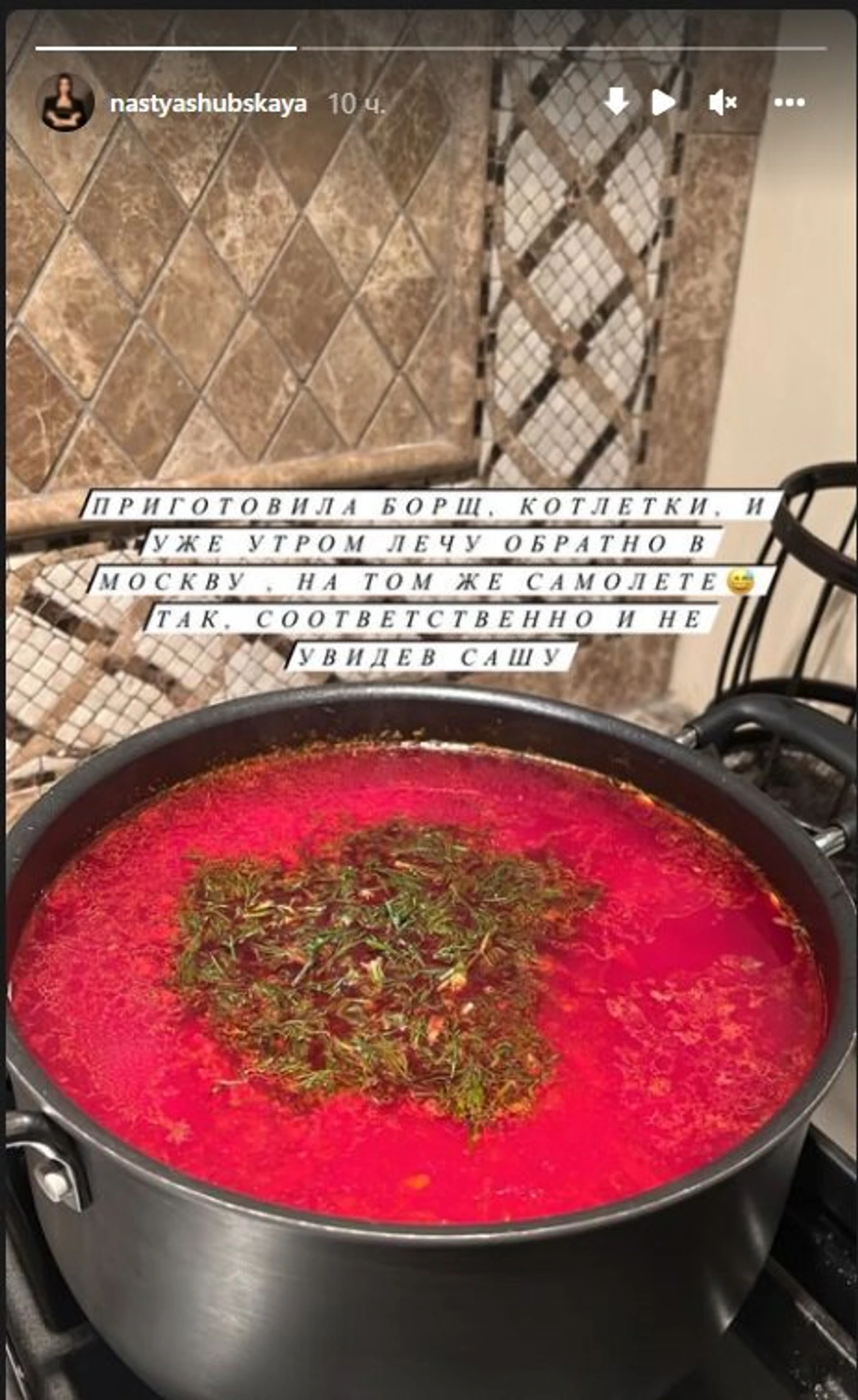 Приготовила борщ, котлетки и уже утром лечу обратно в Москву. На том же самолете. Так, соответственно, и не увидев Сашу», – написала Шубская в сторис инстаграма.