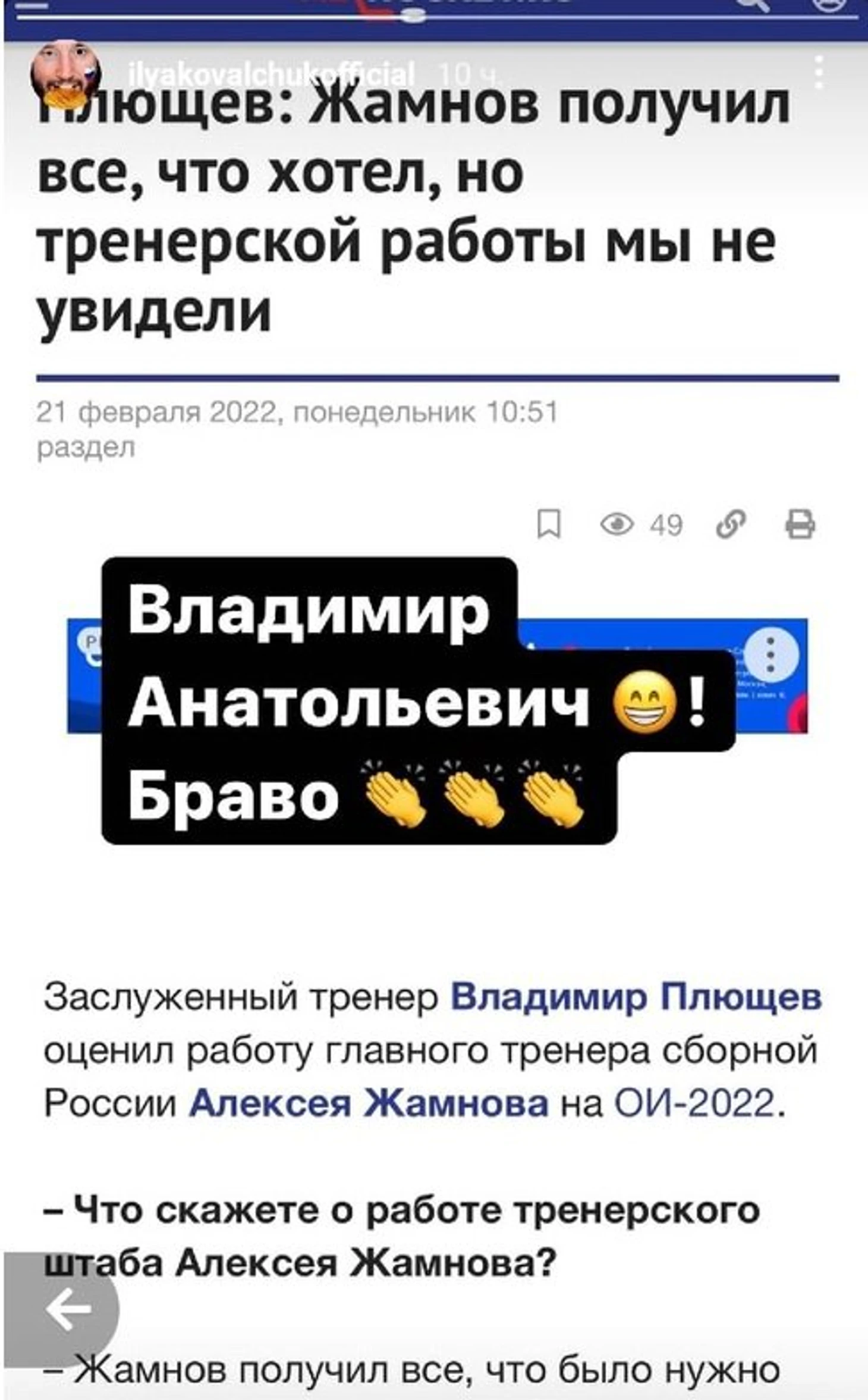 Ковальчук выложил в сторис инстаграма скриншот публикации с высказываниями Плющева и написал: «Владимир Анатольевич! Браво».