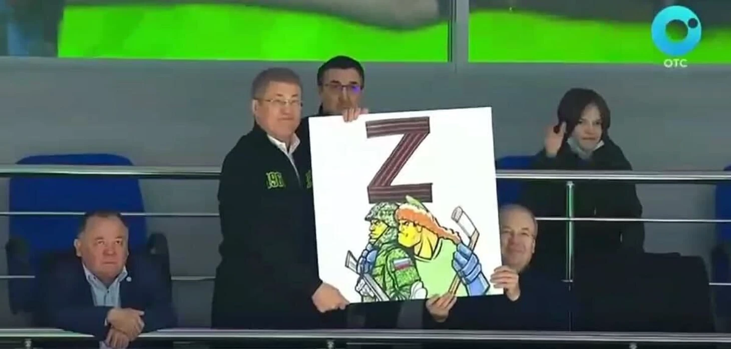 Глава Башкортостана показал плакат с российским солдатом, буквой Z и Салаватом на матче «Салават» – «Сибирь»