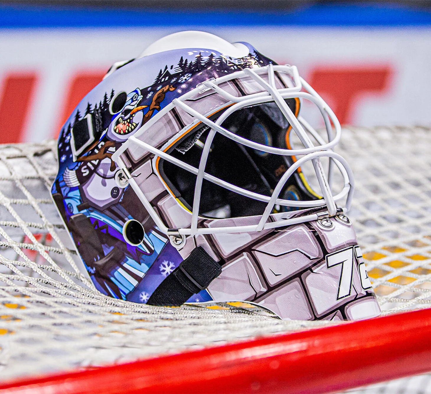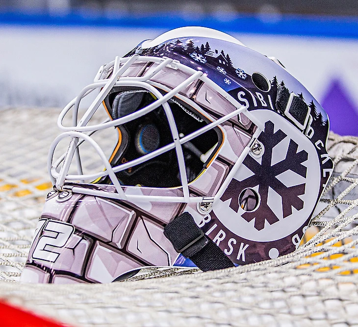 На экипировке вратаря «Сибири» с одной стороны изображен снеговик в болиде «Формулы-1», а на другой стороне – логотип новосибирской команды.