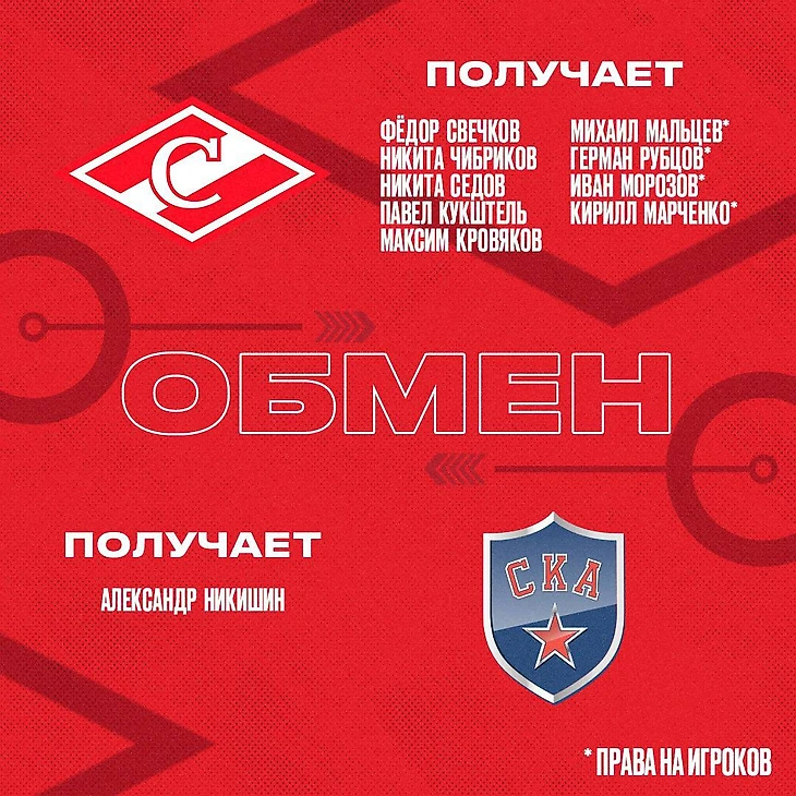 «Спартак» обменял Никишина в СКА на Чибрикова, Свечкова и еще 3 игроков плюс права на Мальцева, Морозова, Марченко и Рубцова