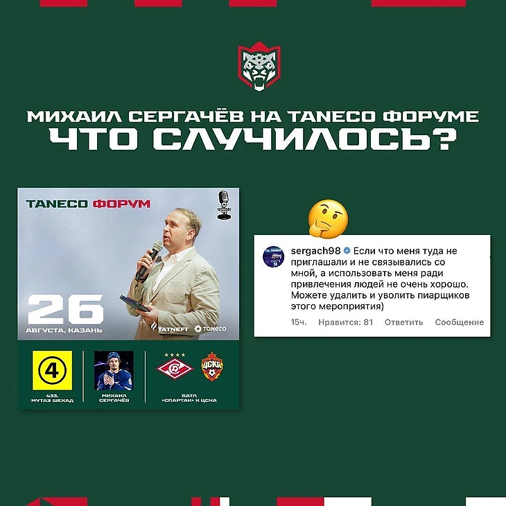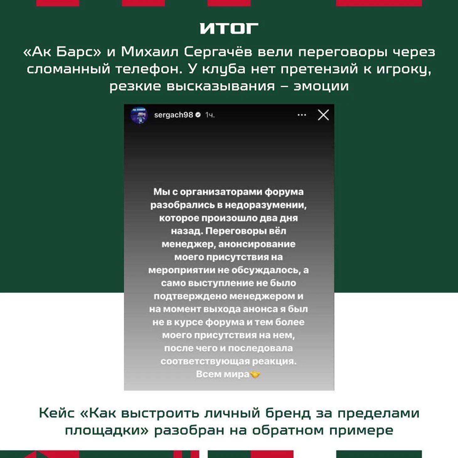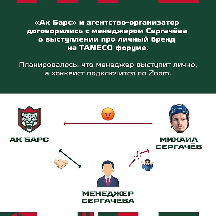«Личный бренд, обвинения, закшвары – это про историю с Сергачевым и наш TANECO форум. Рассказываем, что случилось на самом деле», – говорится в телеграм-канале «Ак Барса».