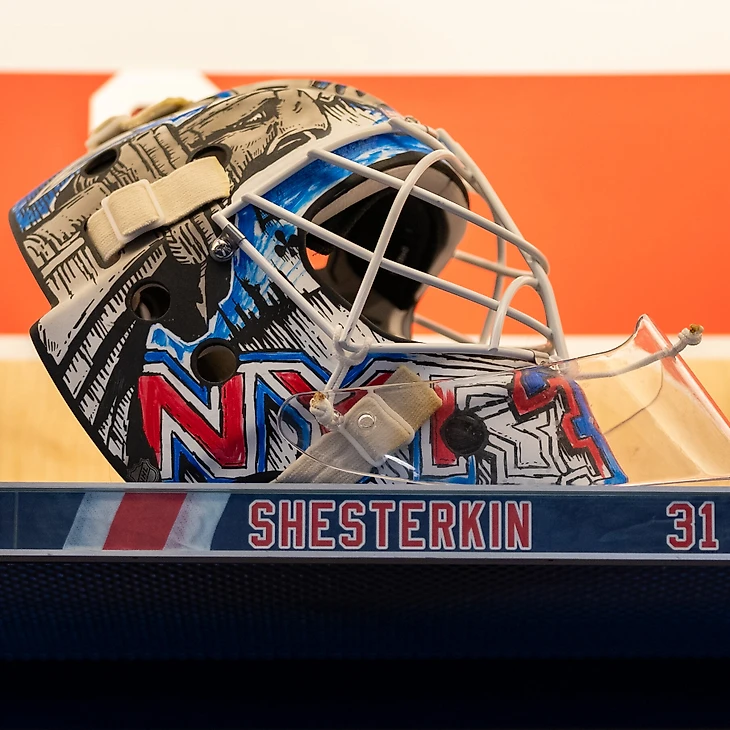 В нижней части шлема размещен 31-й игровой номер Шестеркина, раскрашенный в красно-синие цвета нью-йорского клуба.