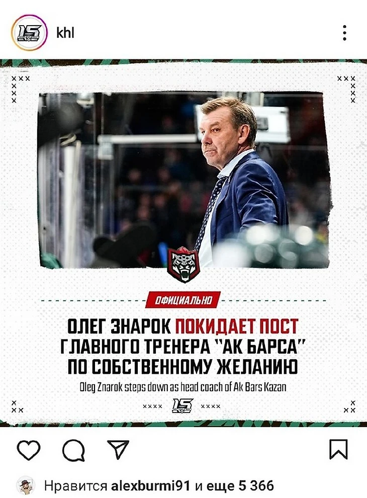 Бурмистров лайкнул пост про уход Знарка из «Ак Барса» в соцсети. Сообщалось, что тренер сказал игроку: «Ты здесь закончил»