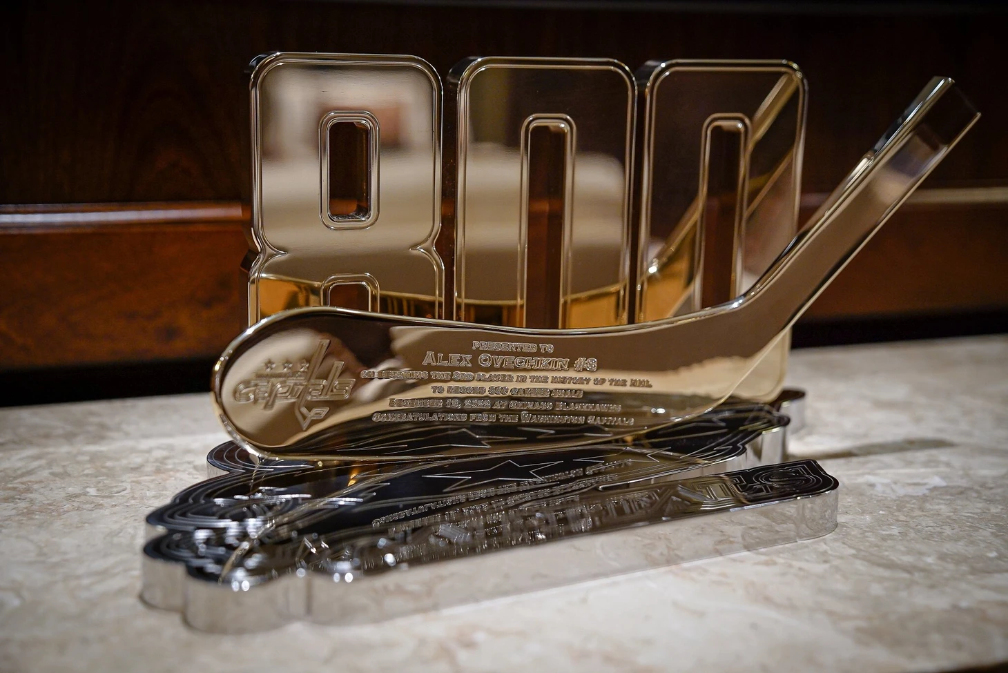 От имени «Кэпиталс» Патрик вручил ему трофей из нержавеющей стали и бронзы. Сергей и Илья Овечкины также получили памятные бронзовые мини-клюшки.