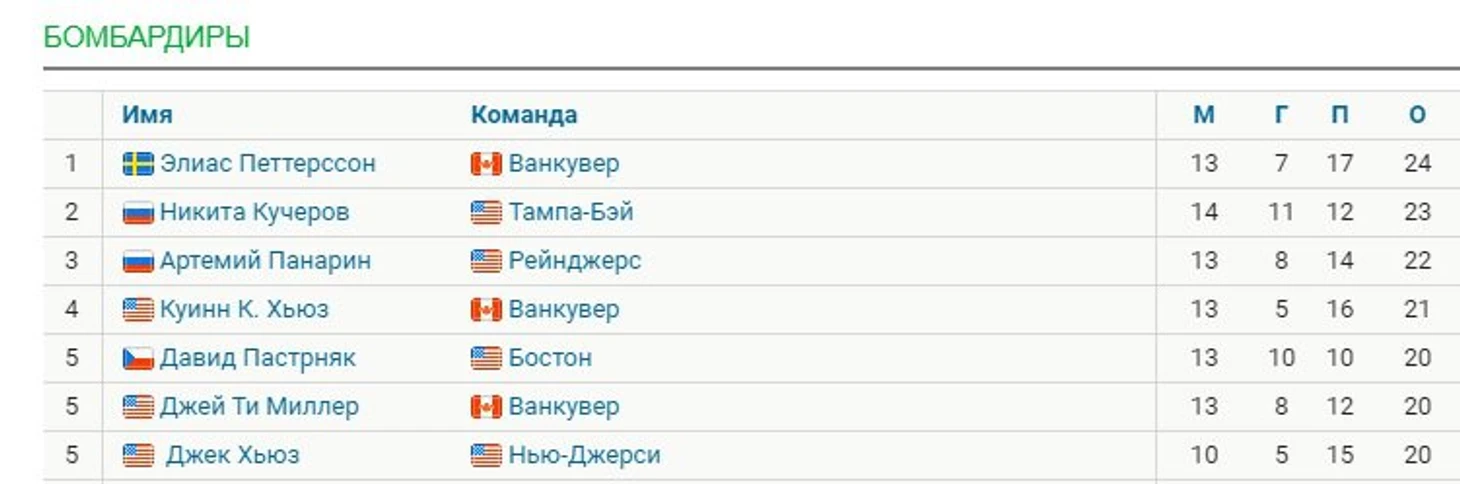 Петтерссон вернул лидерство в гонке бомбардиров НХЛ – 24 очка в 13 матчах. Кучеров – 2-й с 23 в 14, Панарин – 3-й с 22 в 13