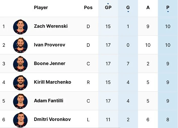 Россиянин делит лидерство в списке лучших бомбардиров «Блю Джекетс» с другим защитником – Заком Веренски (10 очков в 15 играх, 1+9).