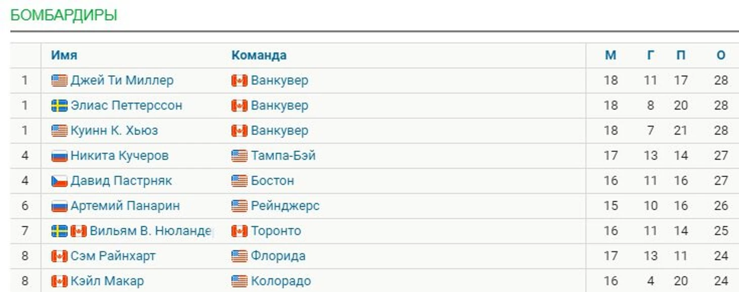 Петтерссон, Куинн Хьюз и Джей Ти Миллер лидируют в гонке бомбардиров НХЛ – по 28 очков у каждого. Кучеров и Пастрняк набрали по 27