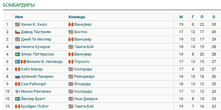 За ними следуют еще один представитель «Кэнакс» Элиас Петтерссон (28 очков в 19 играх, 8+20) и Никита Кучеров из «Тампы» (28 очков в 18 играх, 13+15).