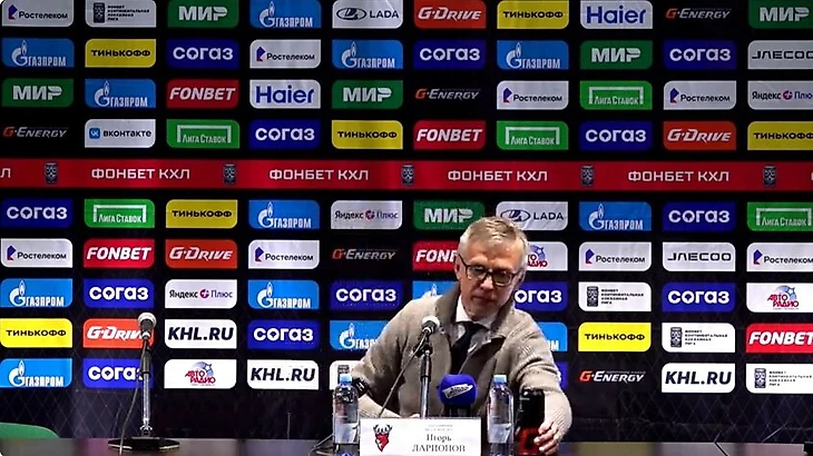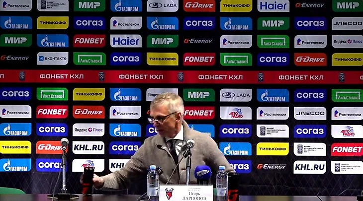 Тренер «Торпедо» Ларионов отодвинул от себя банки с энергетиком на пресс-конференции после игры со СКА