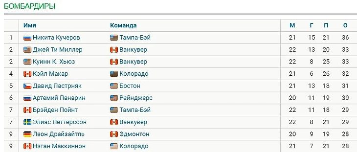 Кучеров продолжает лидировать в гонке бомбардиров НХЛ с 36 очками. У Куинна Хьюза и Миллера по 33, у Макара 32