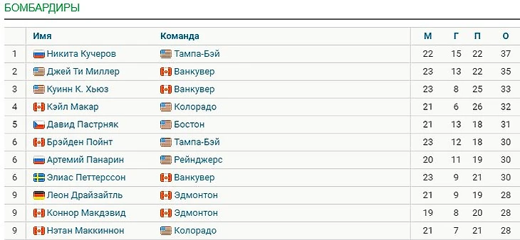 Кучеров продолжает лидировать в гонке бомбардиров НХЛ с 37 очками. У Миллера – 35, Макдэвид с 28 делит 9-е место
