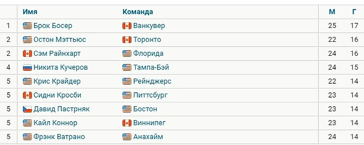 Лидирует Брок Босер из «Ванкувера» – 17 шайб в 25 играх.