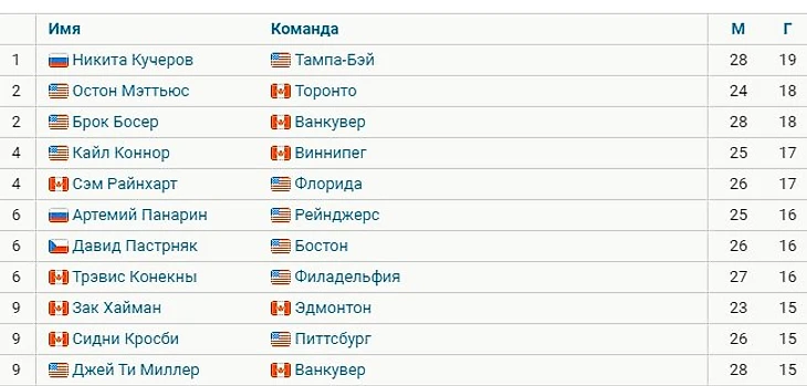 Второе место делят форварды Остон Мэттьюс («Торонто», 18 шайб в 24 играх) и Брок Босер («Ванкувер», 18 в 28).