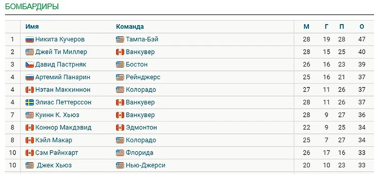 На третьем месте идет форвард «Бостона» Давид Пастрняк (39 очков в 26 играх, 16+23), сегодня набравший 3 (2+1) очка в матче с «Аризоной» (5:3).