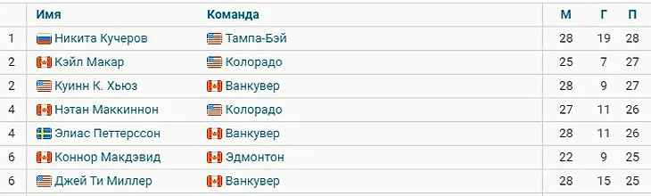 Второе место делят защитники Куинн Хьюз («Ванкувер», 27 передач в 28 играх) и Кэйл Макар («Колорадо, 27 в 25).