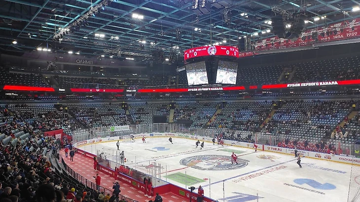При полупустых трибунах начался матч «России 25» на Кубке Первого канала. Команда Ротенберга играет против «Звезд и ВХЛ»