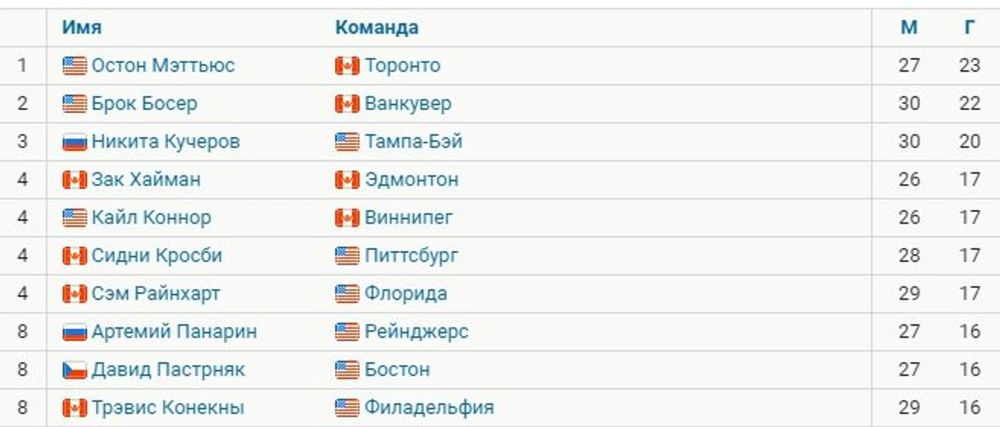 На втором месте идет форвард «Ванкувера» Брок Босер (22 шайбы в 30 играх, сегодня – гол в ворота «Флориды»), на третьем – форвард «Тампы» Никита Кучеров (20 шайб в 30 играх, сегодня – гол в ворота «Эдмонтона» при 3 очках за матч).