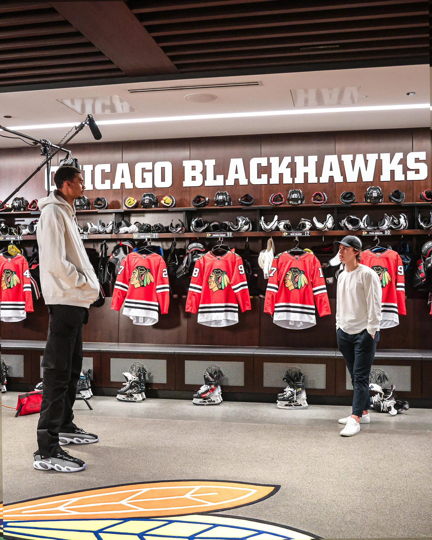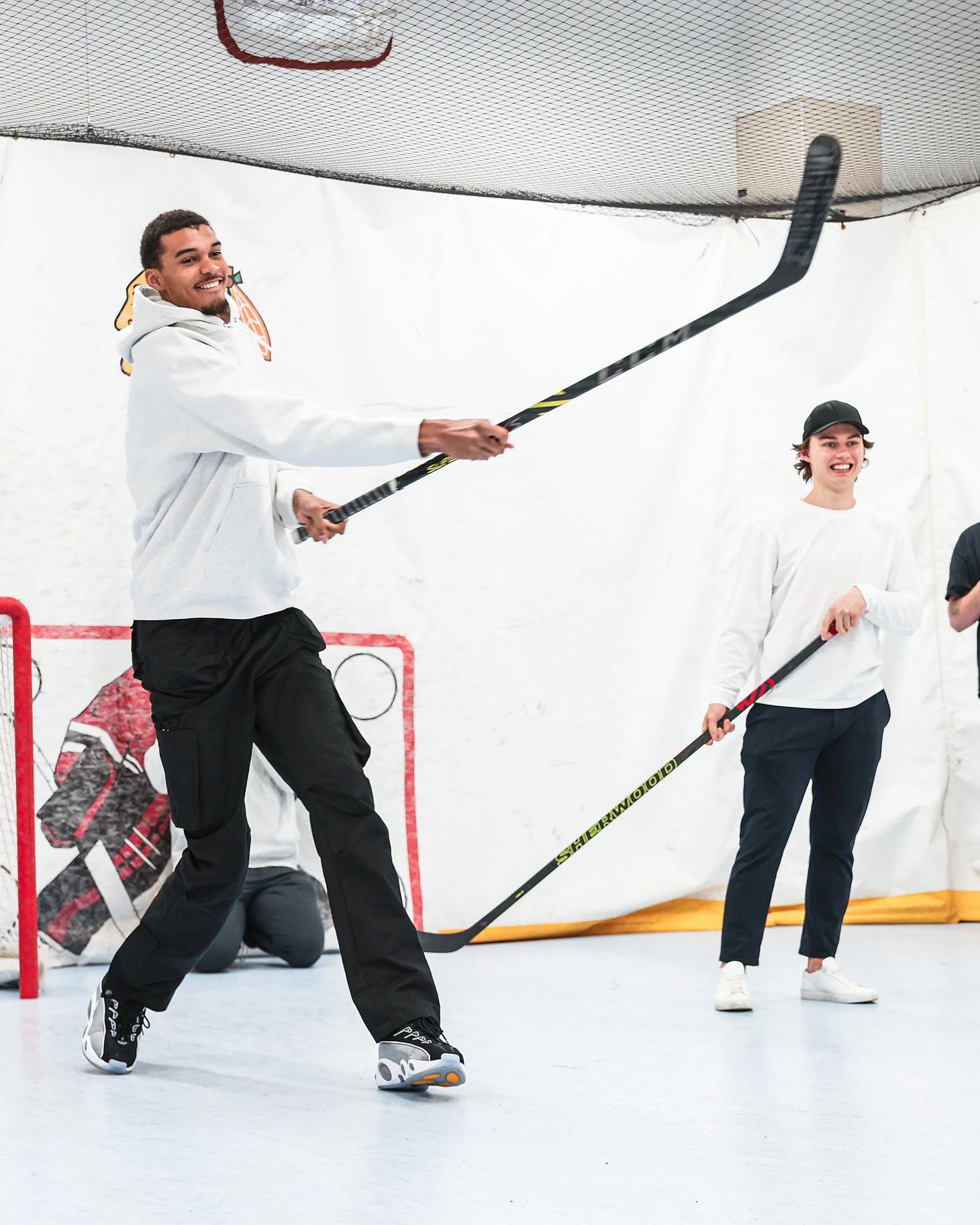 Спортсмены встретились в раздевалке «Чикаго Блэкхокс». На фотоснимках запечатлено, как Вембаньяма держал хоккейную клюшку в руках, нанося броски по воротам.