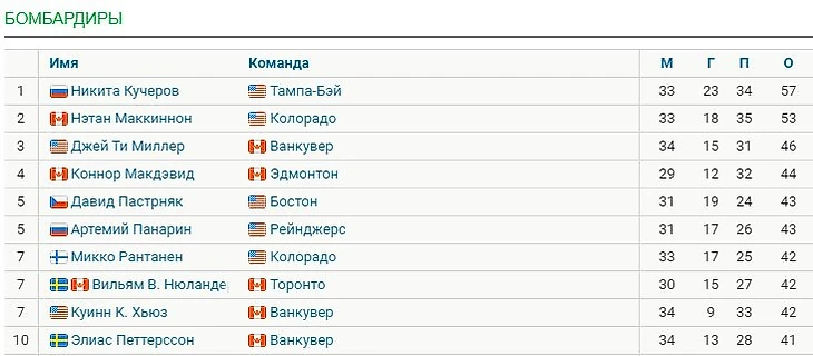 Отметим, что «Тампа» провела в сезоне 34 игры (Кучеров пропустил одну из-за болезни), «Эдмонтон» – 31 (Макдэвид пропустил 2 из-за травмы). Маккиннон и Миллер идут без пропусков.