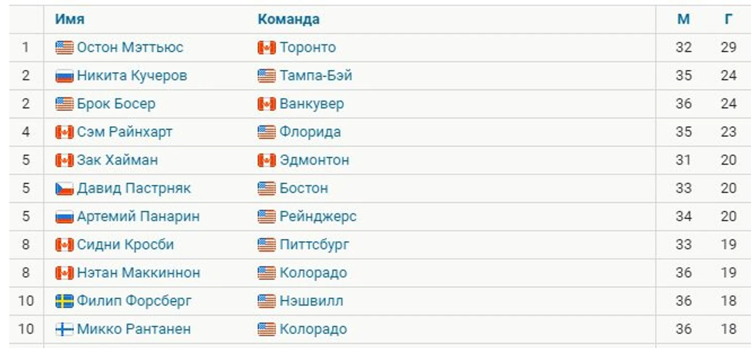 Американец продолжает лидировать в гонке снайперов, увеличив отрыв от преследователей до 5 шайб. Второе место делят Никита Кучеров («Тампа», 24 шайбы в 35 играх) и Брок Босер («Ванкувер», 24 в 36).