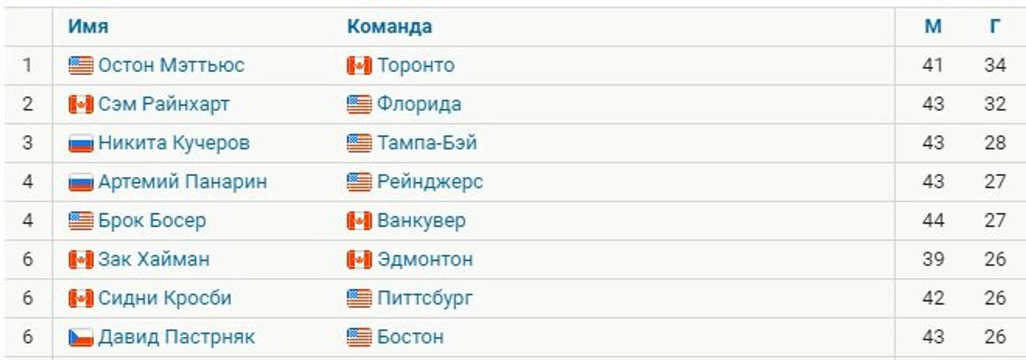 Мэттьюс забросил 34 шайбы в 41 игре и лидирует в гонке снайперов НХЛ. У Райнхарта 32 в 43