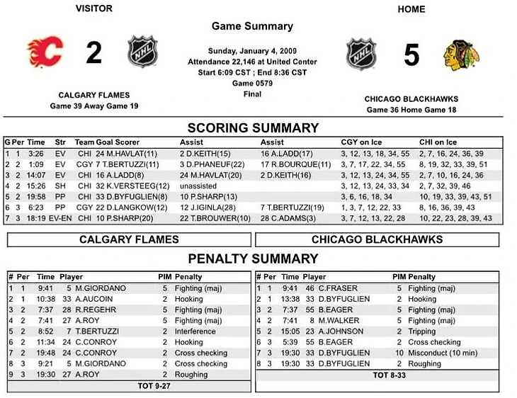 Журналист «Спорт-Экспресса» выложил скриншот протокола матча регулярного чемпионата НХЛ между «Чикаго» и «Калгари» (5:2), состоявшегося на домашней арене «Блэкхокс» United Center 4 января 2009 года. Игру посетили 22 146 зрителей.