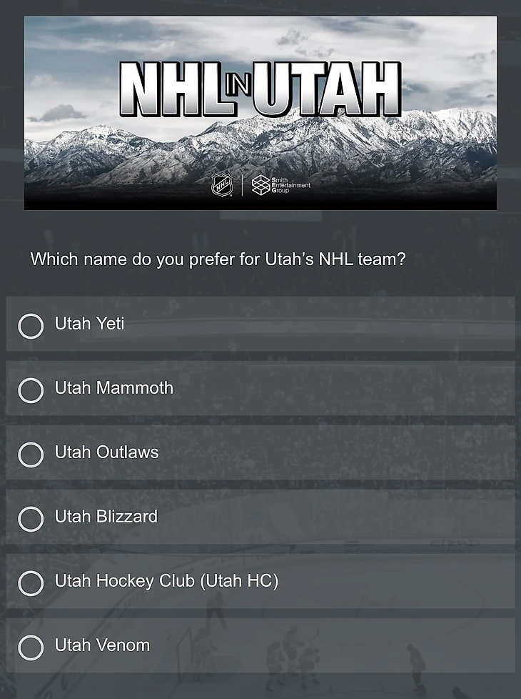 Сейчас франшиза выбирает название для команды, которая стартует в НХЛ. Ранее владелец «Юты» Райан Смит сообщил, что команда будет носить майки с надписью «Юта» в течение первого сезона, а затем введет название и логотип в сезоне-2025/26.