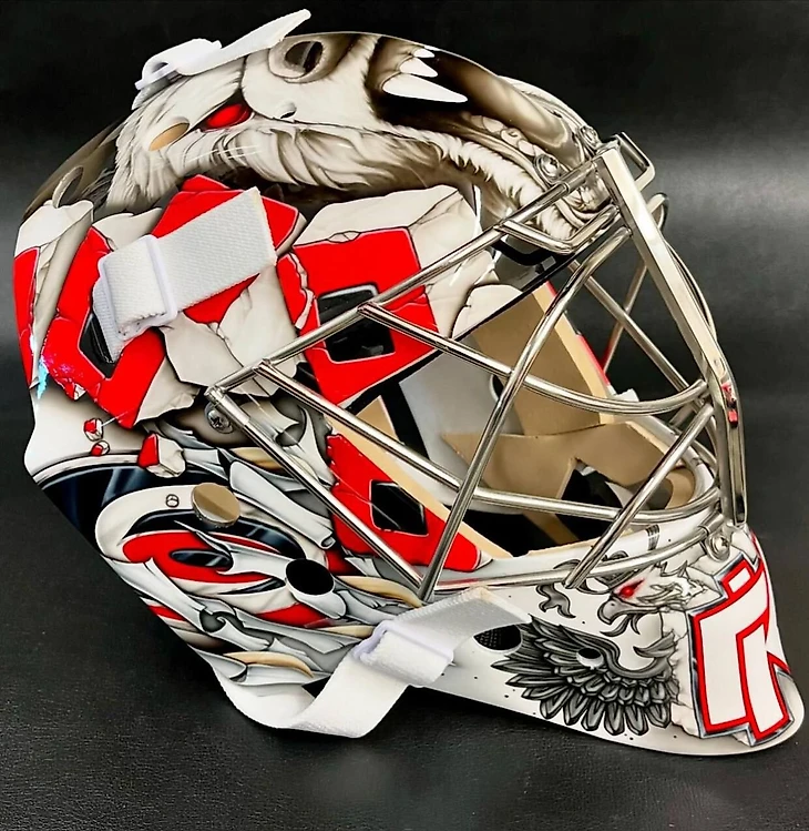 25-летний голкипер «Каролины» представил свой новый шлем в клубных цветах.
