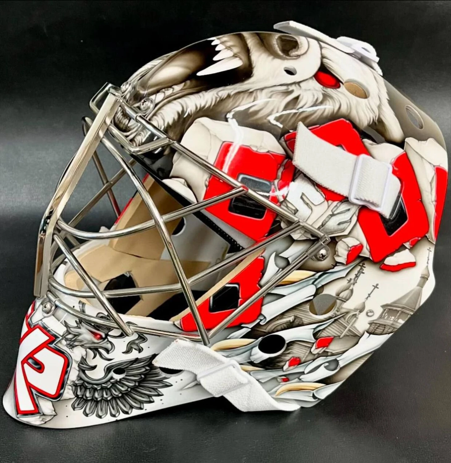 Кочетков представил новый шлем. На маске изображены герб России, медведь и купола церкви