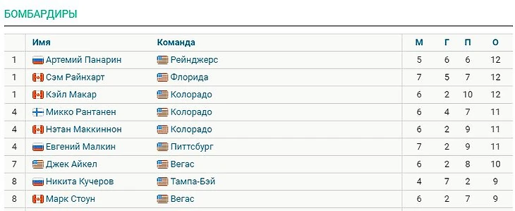 За лидерами следуют два партнера Макара (форварды Нэтан Маккиннон и Микко Рантанен), а также нападающий «Питтсбурга» Евгений Малкин. У всех троих сейчас по 11 очков.