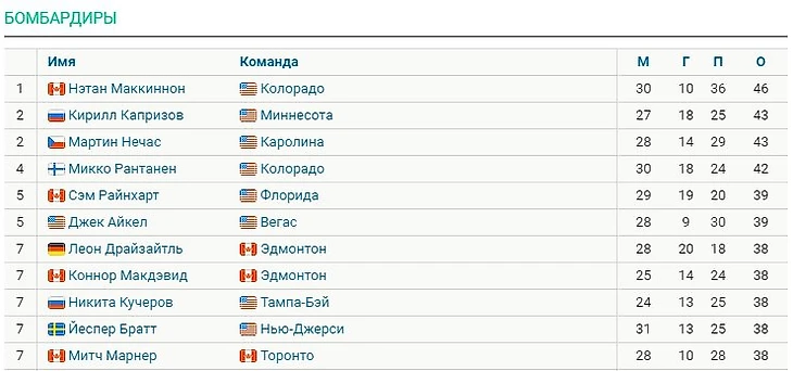 29-летний Маккиннон единолично возглавил гонку бомбардиров НХЛ с 46 (10+36) очками в 30 играх, обогнав Кирилла Капризова из «Миннесоты» (43 очка в 27 играх, 18+25) и Мартина Нечаса из «Каролины» (43 в 28, 14+29).