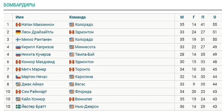 Лидером гонки является форвард «Колорадо» Нэтан Маккиннон с 55 (14+41) очками в 35 играх.