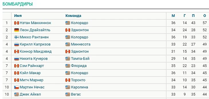 Маккиннон набрал 57 очков в 36 матчах и возглавляет гонку бомбардиров НХЛ с отрывом в 5 баллов. Макдэвид догнал Кучерова и Капризова
