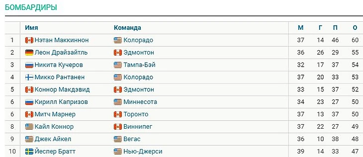 Также в топ-5 идут форварды Никита Кучеров («Тампа», 54 в 32, 17+37, сегодня – гол в ворота «Монреаля»), Микко Рантанен («Колорадо», 53 в 37, 20+33) и пятикратный обладатель «Арт Росс Трофи» Коннор Макдэвид («Эдмонтон», 52 в 33, 15+37, сегодня – 2 передачи в матче с «Дакс»).