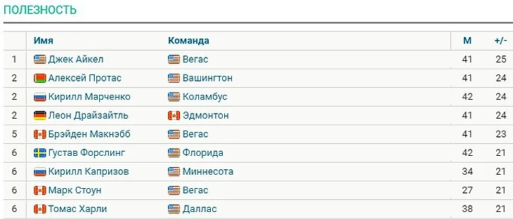 Лидирует форвард «Вегаса» Джек Айкел с «+25». Единственным защитником в топ-5 является другой представитель «Голден Найтс» – Брэйден Макнэбб с «+23».
