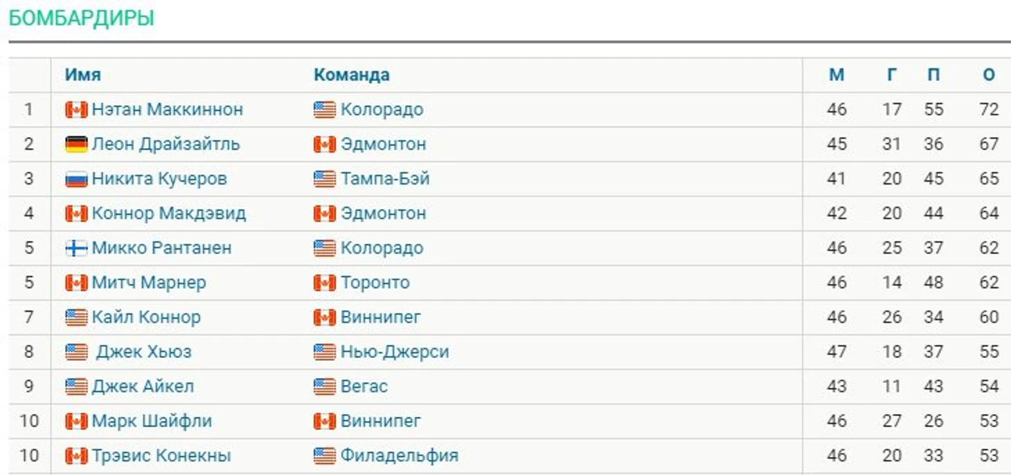 В топ-4 также входят форварды Никита Кучеров («Тампа», 65 в 41, 20+45, сегодня – 2 передачи в матче с «Анахаймом») и Коннор Макдэвид («Эдмонтон», 64 в 42, 20+44, сегодня – 1+1 в матче с «Колорадо»).