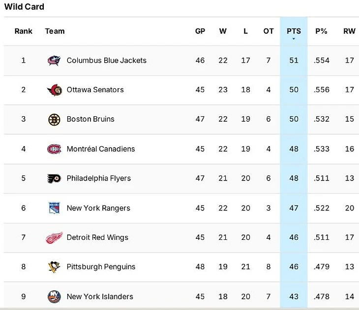Обе команды набрали по 50 очков, но у «Сенс» сыграно меньше матчей (45 против 47) и одержано больше побед в основное время (17 против 15).