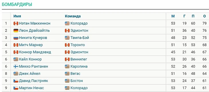 На втором месте идет форвард «Эдмонтона» Леон Драйзайтль (76 очков в 51 игре, 36+40), на третьем – форвард «Тампы» Никита Кучеров (75 в 48, 23+52).
