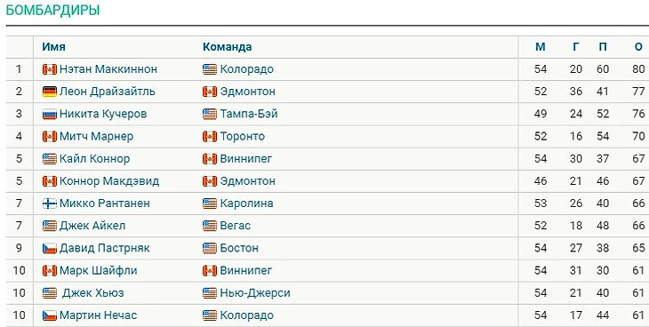 На втором месте идет форвард «Эдмонтона» Леон Драйзайтль (77 очков в 52 играх, 36+41), на третьем – форвард «Тампы» Никита Кучеров (76 в 49, 24+52).