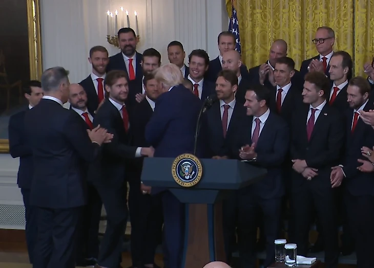 «Это была настоящая битва от начала и до конца. Еще интереснее она была благодаря голкиперу Сергею Бобровскому. Он был невероятен! Я должен увидеть его, где он? (В этот момент Трамп повернулся, подошел и пожал руку Бобровскому – Спортс’‘.)
