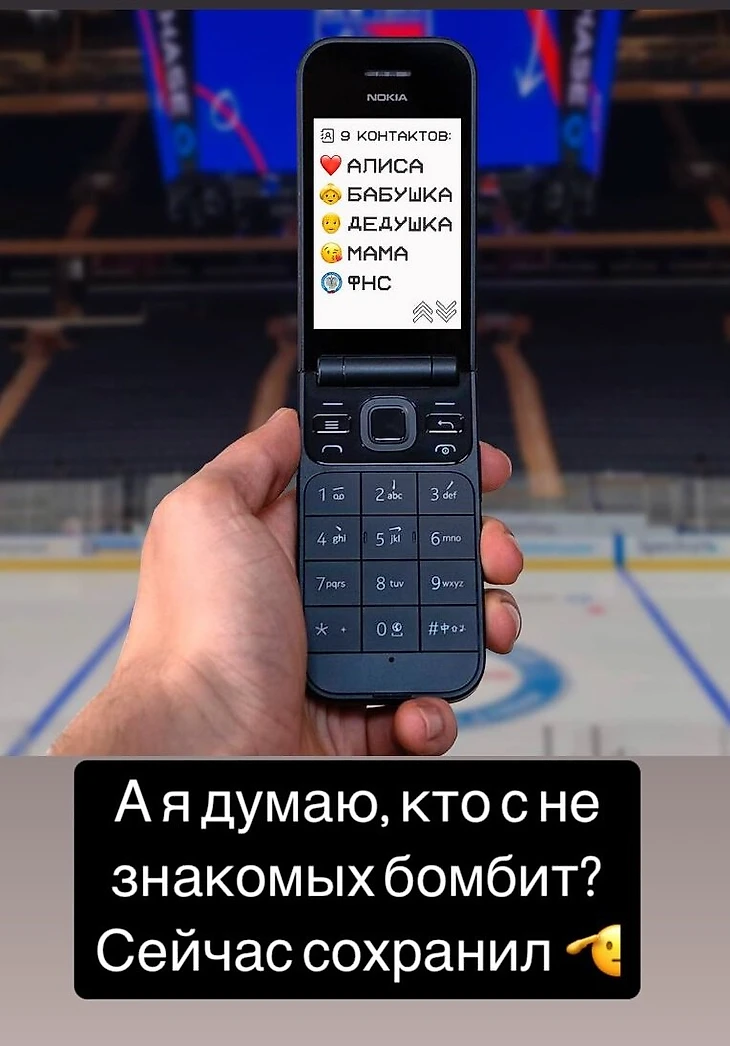 «А я думаю, кто с незнакомых [номеров] бомбит? Сейчас сохранил 🫡», - написал Панарин в сториз социальной сети, приложив фото кнопочного телефона со списком контактов, среди которых есть аббревиатура ФНС.