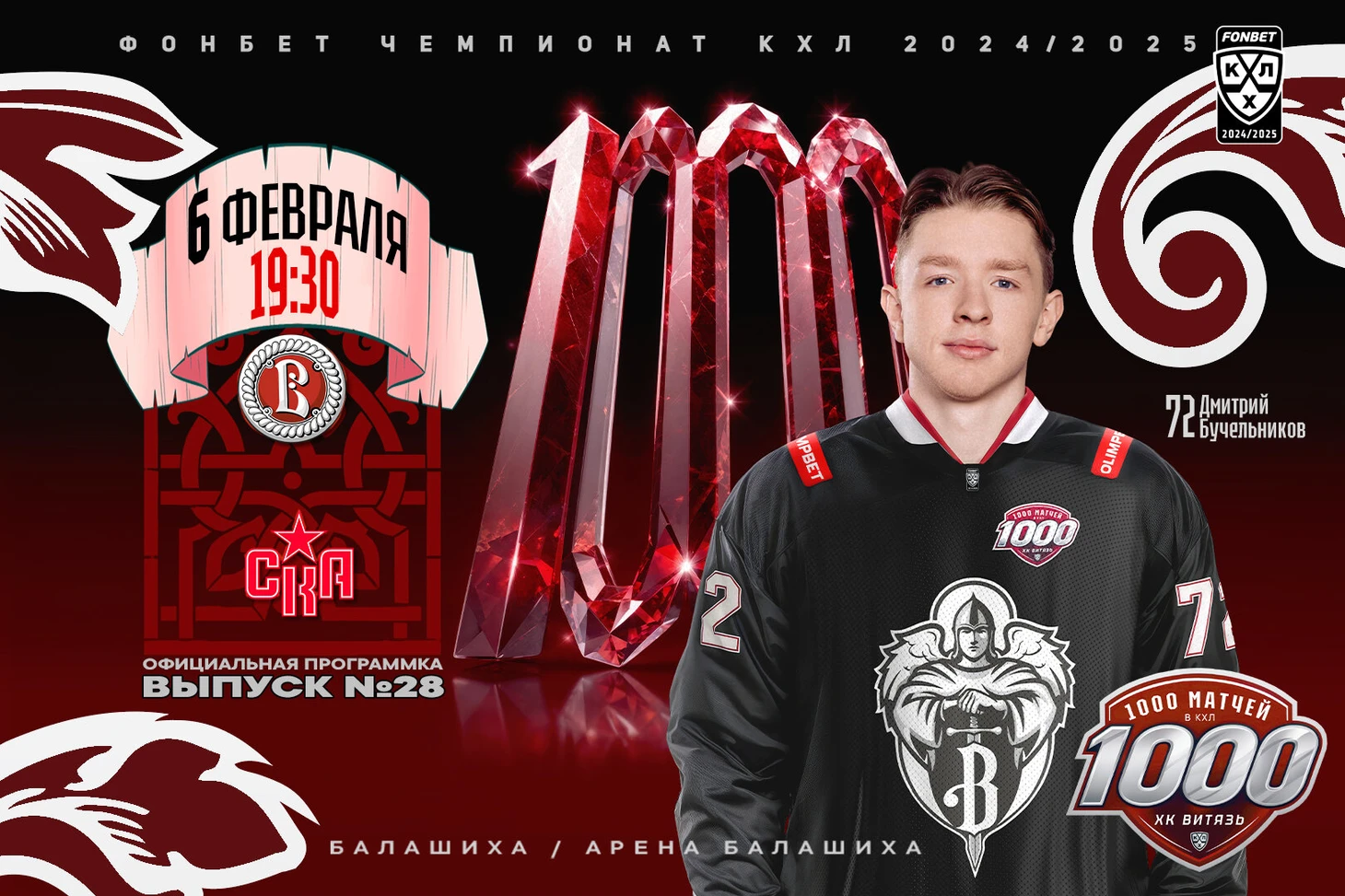 «Отмечаем 1000-й матч нашего «Витязя» в Континентальной хоккейной лиге! Представляем альтернативную форму и лого нашего клуба! Событие историческое. И, конечно же, хоккей под стать – очередная встреча с одним из самых крутых клубов нашей лиги.