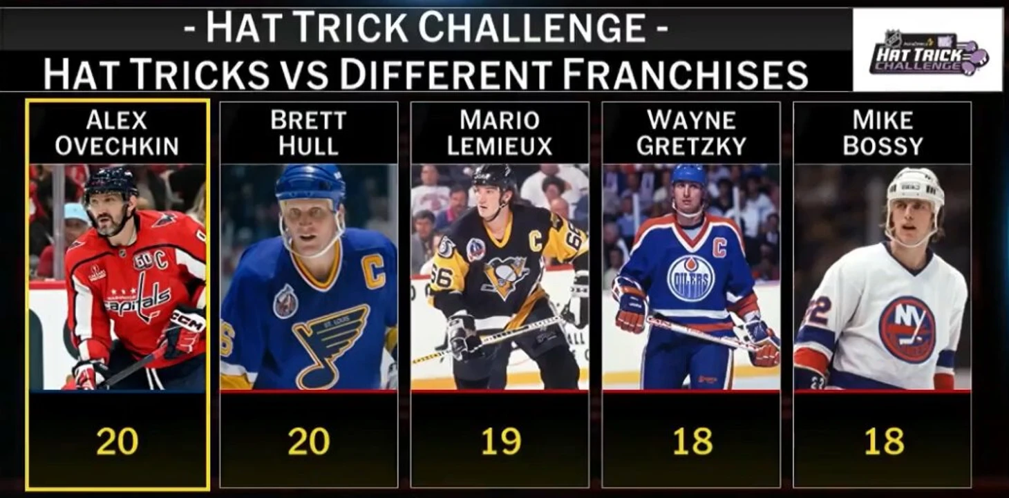 По этому показателю Овечкин повторил рекорд лиги, установленный Бреттом Халлом. Марио Лемье забрасывал по 3+ шайбы за матч в ворота 19 команд, Уэйн Гретцки и Майк Босси огорчили по 18 команд.