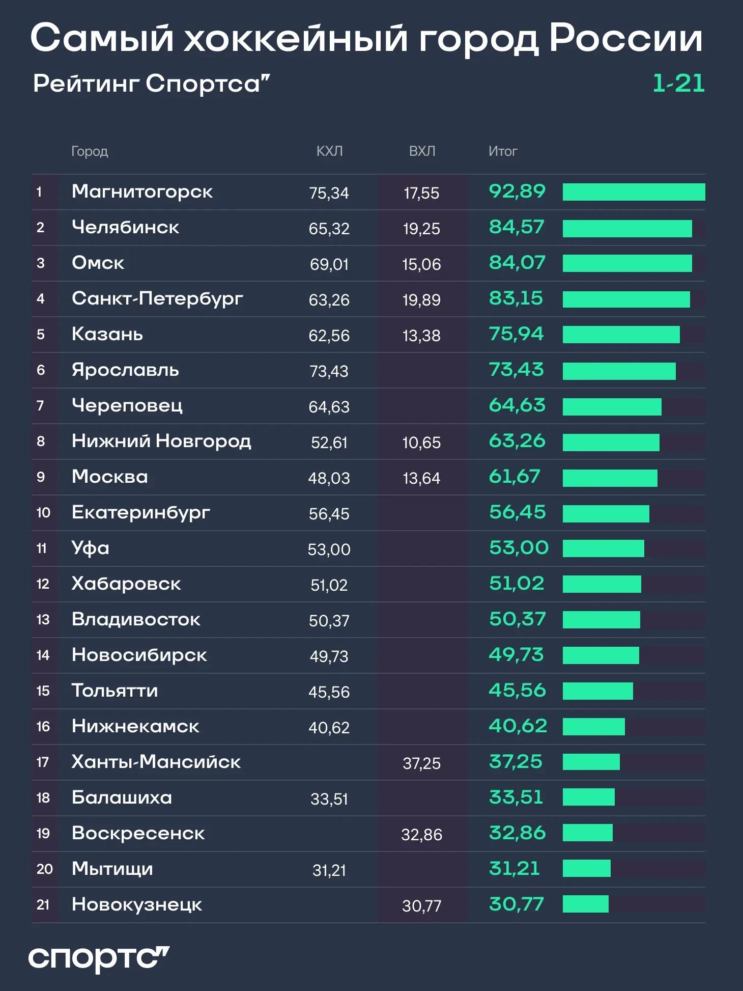 Магнитогорск – самый хоккейный город России по версии Спортса’’, Челябинск – 2-й, Омск – 3-й, Петербург – 4-й