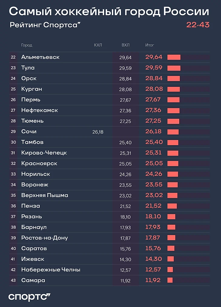 Спортс’’ составил рейтинг хоккейных городов России. В фокус попали 43 российских города, в которых выступает хотя бы одна команда из Фонбет Чемпионата КХЛ и Olimpbet ВХЛ.