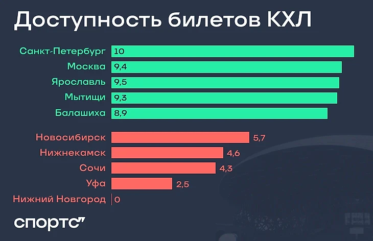 Спортс’’ составил рейтинг хоккейных городов России. Одной из частей исследования была оценка стоимости билетов. Она исходила из соотношения средней зарплаты в городе к стоимости наиболее дешевых билетов на матч.