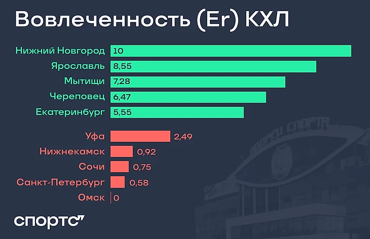 Однако у Нижнего Новгорода суммарный уровень вовлеченности 2,44 (лидеры в КХЛ) при 209,7 тысячах подписчиков.