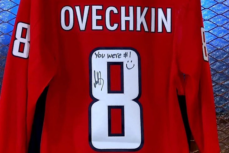 На свитере можно увидеть надпись: «Ты был номером 1». Один из ведущих TVA пошутил, что его удивил красивый почерк Овечкина.