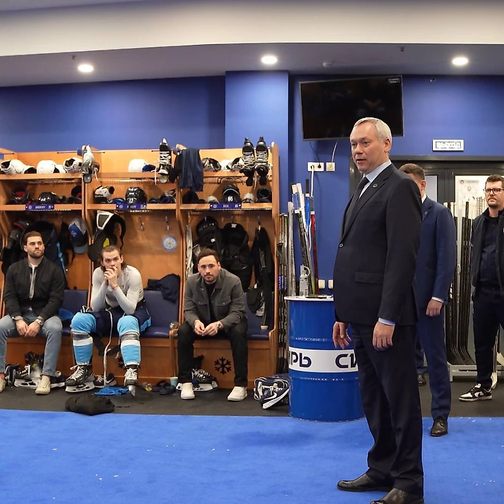 Губернатор Травников посетил раздевалку «Сибири» после матча с «Ак Барсом». Он поблагодарил игроков и пожелал им удачи в плей-офф